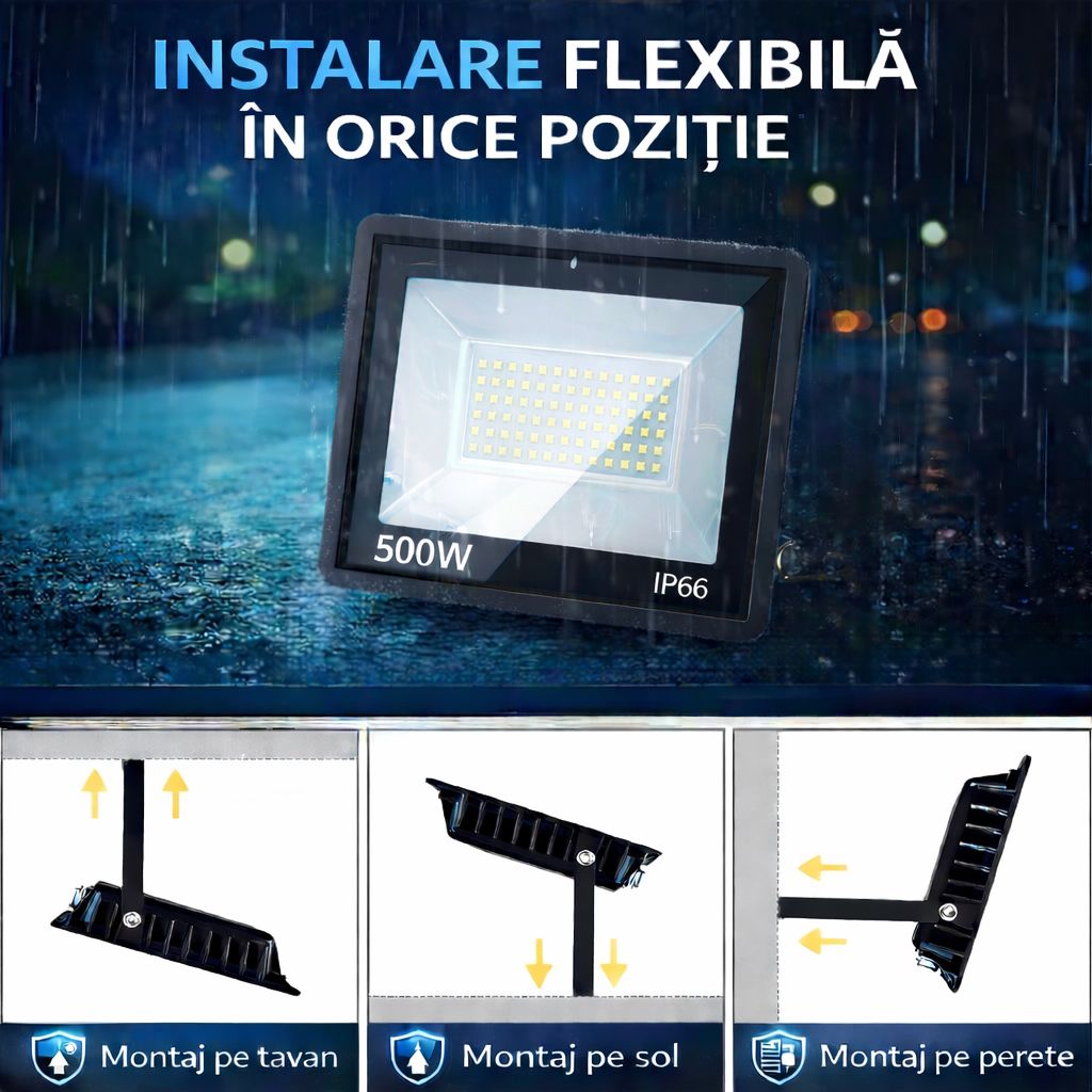Proiector LED JORTAN Exterior 500W, Alimentare 230V, 420 LED-uri, 30000 Lumeni, Lumina Calda Intensa, Carcasa Aluminiu + Sticla, IP66 Rezistent la Apa si Praf, pentru Curte, Alee, Garaj si Parcare